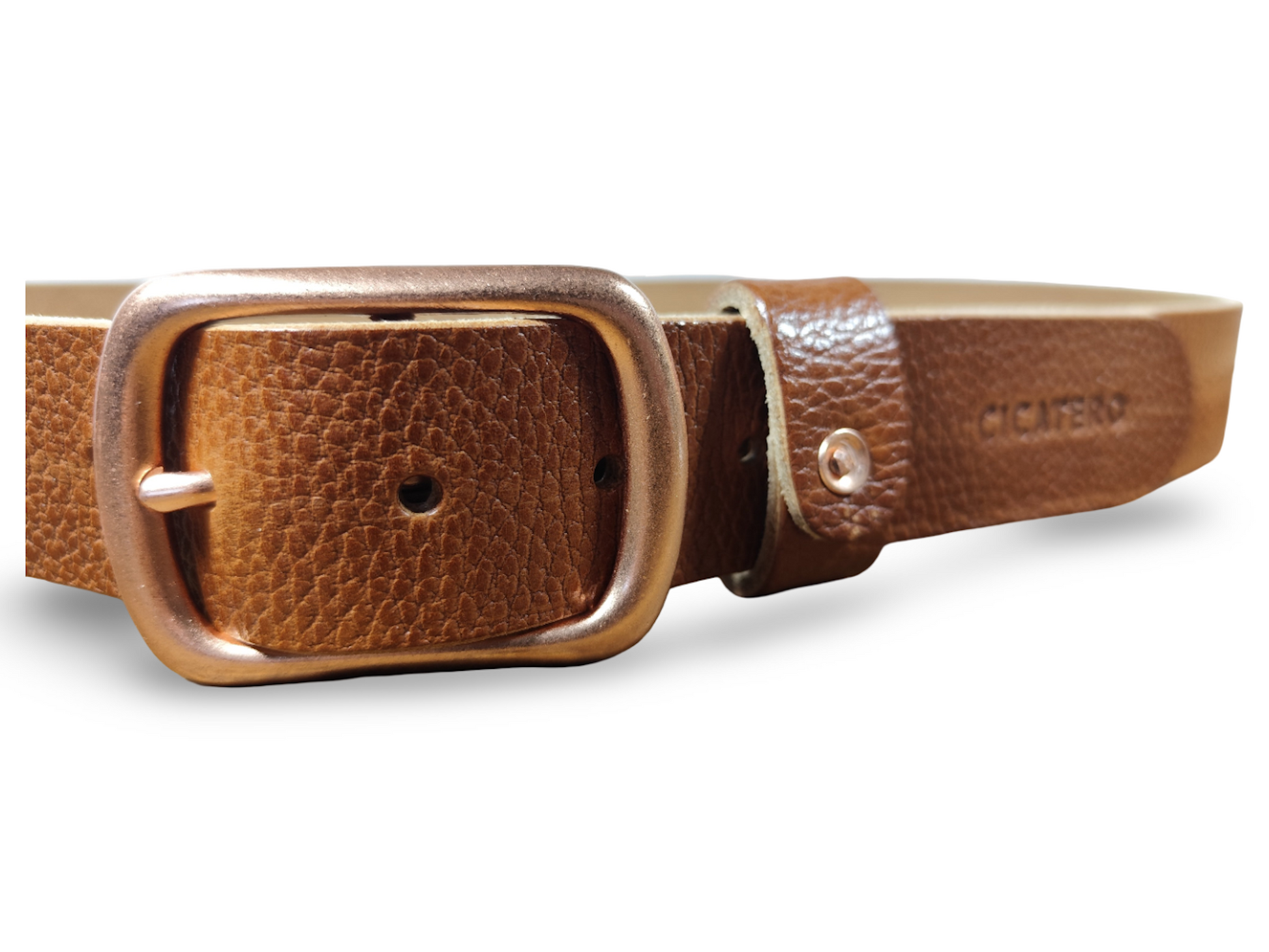 La correa es de cuero natural vegetal de curtición ecológica durante un periodo de 45 días en la montaña Palentina y mide 38 milímetros de altura.